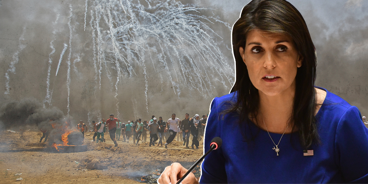 أما مؤخراً، في 14 مايو 2018، بعد "مجزرة قطاع غزة" يوم نقل السفارة الأمريكية للقدس وذكرى النكبة الفلسطينية، قالت هايلي في اجتماع طارئ لمجلس الأمن على خلفية "التوتر في الأراضي الفلسطينية": "لا يوجد أي بلد في هذا المجلس يتحلى بضبط النفس أكثر من إسرائيل. وفي الحقيقة فإن سجل العديد من الدول الموجودة هنا اليوم، يشير إلى أنها ستتصرف بدرجة أقل بكثير من ضبط النفس"، وأضافت أن "منظمة حماس هي التي تحرض على العنف، منذ سنين قبل أن تقرر الولايات المتحدة نقل سفارتها".