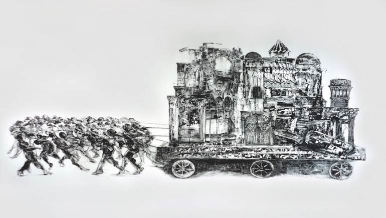 على أن الحيطة من الموضوع، وإكباره، وكما تشير لوحات مراد أو جدارياته(*)، يؤديان إلى إيفائه حضوره، وهذا ليس من خلال اتصافه بسمات عديدة كالكثافة، أو بما تدعوه المدونة النقدية المتقادمة بـ"الانسياب"، وهو فعلياً هبوب، بل استناده إلى الغياب. ففي مجموع تشخيطه، هناك فراغ، ولونه أبيض، وفي الكثير من الأحيان، يبدو محرك الموضوع، لا سيما عندما يتعلق بالفرار على إثر التشريد، وعندما يبدو على وشك التواري، ليس بسبب اعتلال في تمثيله، بل على العكس، بسبب متانة هذا التمثيل، الذي لا يستوي على النسخ طبعاً، بل على تخيل لمعناه، أو على تشبيهه.