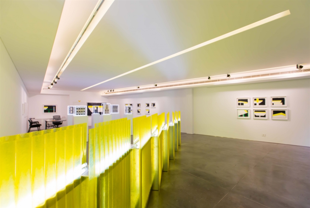 أما في الغاليري، فهناك ثلاثة معارض متراكبة. يطالعك بدايةً تجهيز من البلاستيك المزجج الأصفر الفاقع، خلفه إضاءة «نيون» بيضاء، تجعل الرؤية فوسفورية مدهشة، كأضواء المدينة الليلية. يمر عبرها الزائر ليصل إلى مجموعة من ست منحوتات معروضة في وسط المساحة، هي عملياً مهندسة ومصممة ومنفذة عبر مواد من هذه المدينة، وفي بيروت. اختار راكوي أشكالاً محددة من «الخفّان» كثير الاستخدام في بيروت. يجمع كل عنصرين منها خط من الصباغ الفوسفوري، ويحيطها بـ «نيون» أبيض على شكل مكعب كأنها هالة هندسية. هي الهالة الضوئية نفسها التي تراها عيوننا في تفاصيل المدينة، من دون أن تحدد هويتها. وقرب هذه المنحوتات، مجموعة من اللوحات بأحجام مختلفة، مؤطرة بزجاج، مشغولة بوسائط مختلفة على ورق. بعنوان «سلسلة محطات البنزين». هي عملياً اختصار بصري مينيمالي مبدع لأكثر الأماكن إضاءة في بيروت: محطات البنزين. قد يظن الزائر أن المعرض ينتهي هنا، لكن المتعة البصرية تستمر عندما ترشدك غايا فودوليان، بابتسامة ملؤها التشويق، إلى غرفة جانبية داخلية في صالة العرض، فدخل لترى مجموعة من الزجاج المركب بأشكال أفقية وعامودية على الحائط، وبينها ضوء «نيون» يجعل من احتمالات الظلال لا متناهية. يبقى أن أبلغ ما يصف أعمال راكوي هي تعابير اختارتها الغاليري للتعريف عن المعرض: «يستخدم راكوي الضوء لبناء الفضاء من خلال محاكاة الطريقة التي تحدد بها المباني ومجمعات المدينة والشوارع. تلتقط أعماله الأحاسيس اللونية للشوارع المقفرة عند الفجر، حيث يتلاشى الجو مع توهج ضوء النهار إلى الليل والظلال الناتجة عن الروافع الدخيلة والسقالات والمباني الهيكلية. إن المنحوتات الناتجة - الأشكال الهندسية المدهشة والأعمدة المذهلة للضوء - تجمع بين الجمال المذهل وصدمة التصنيع، وربما تقدم تمثيلاً حقيقياً لتفاوتات الحياة المعاصرة».