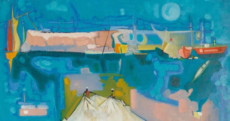 ويستدير القمر في فضاء عكا التجريدي حارسا/ سراجا/ مؤجلا وتنمو الخطوط والمستطيلات الضيقة في اللوحات كأعشاب بحرية نمت على شباك متقطعة لصيادين غادروا البحر لينتشروا من المحيط إلى الخليج، ولكن لم يغادروا لا الذاكرة ولا وجدان الفنان توفيق عبدالعال.