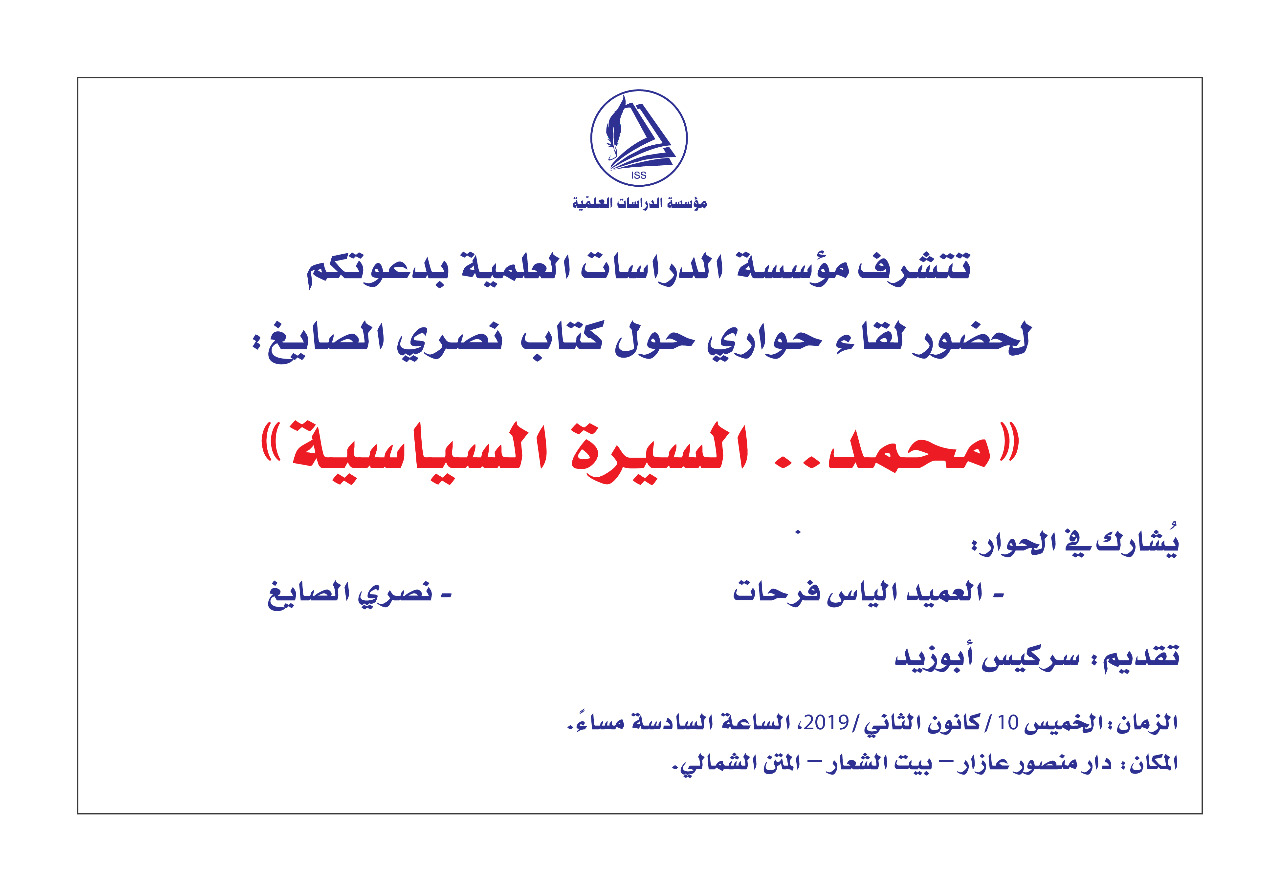 تتشرف مؤسسة الدراسات العلمية بدعوتكم لحضور لقاء حواري حول كتاب نصري الصايغ:
