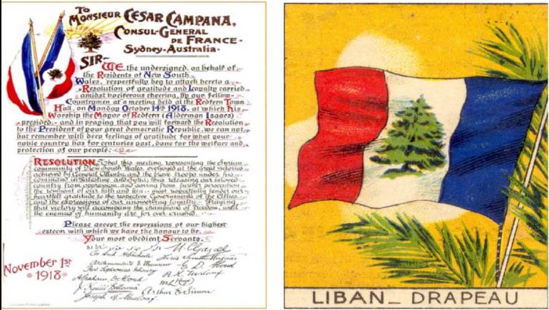 دخل لبنان في حقبة الانتداب الفرنسي، وكتب شكري الخوري مقالة ناشد فيها فرنسا باعتماد راية لبنانية تجمع بين الأرزة الخضراء وألوان العلم الفرنسي الثلاث، الأزرق والأبيض والأحمر. وفي أيار/مايو 1919، كتب صاحب جريدة "الهدى" ورئيس الرابطة اللبنانية في نيويورك نعوم مكرزل مقالة ساند فيها البطريرك حويك في مسعاه إلى تحقيق استقلال لبنان، ورأى ان الراية اللبنانية ستحمل ألوان الراية الفرنسية مع الأرزة في وسط اللون الأبيض. أعتُمد هذا العلم رسميا في سنة 1926، وتبدّل مع استقلال لبنان في 1943.