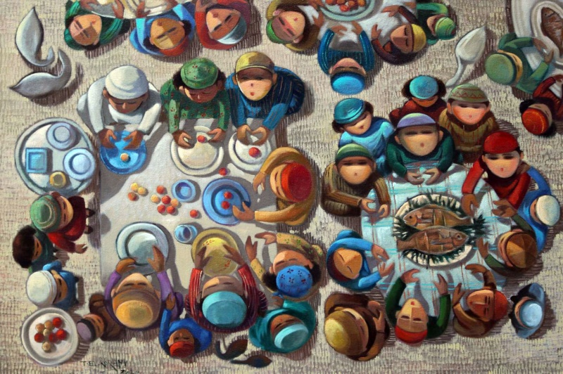 ويشير القرني لـ“العرب” إلى أن منظور عين الطائر، الذي قام عليه هذا المعرض، فكرة جديدة على الوسط التشكيلي في العالم أجمع، فثمة تجاوز لمسألة المنظور بما يتماس مع فكرة المعرض وهدفه، حيث أراد أن يجعل هؤلاء الناس محط الاهتمام والتركيز، وأن يعيد الاهتمام بذلك الإنسان البسيط الذي يذهب إلى الأسواق ويمارس احتفالاته وحياته البسيطة، فهذا هو الوجه الجمعي للإنسان البسيط في العالم ككل الذي أراد أن يضعه “فوق الرأس”.