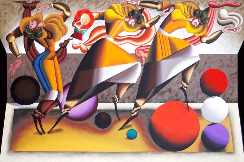 وعلى الرغم من الإيقاع الحركي الصاخب لشخوص الفنان المنتفضة والراقصة والسابحة والطائرة و”المتشقلبة” بهيئات بهلوانية متعددة في فضاء لوحاته، غير أن الناظر إلى الأعمال يجد نفسه يبحث في اللوحة وغناها التشكيلي وخلفياتها التاريخية وأبعادها الفكرية الشعورية واللاشعورية عن شخصية أسطورية تنتمي إلى الفولكلور الأوروبي، وهي “بائع الرمل” الذي يذري حبوب الرمل أو الغبار السحري في عيون الأطفال لكي يناموا.
