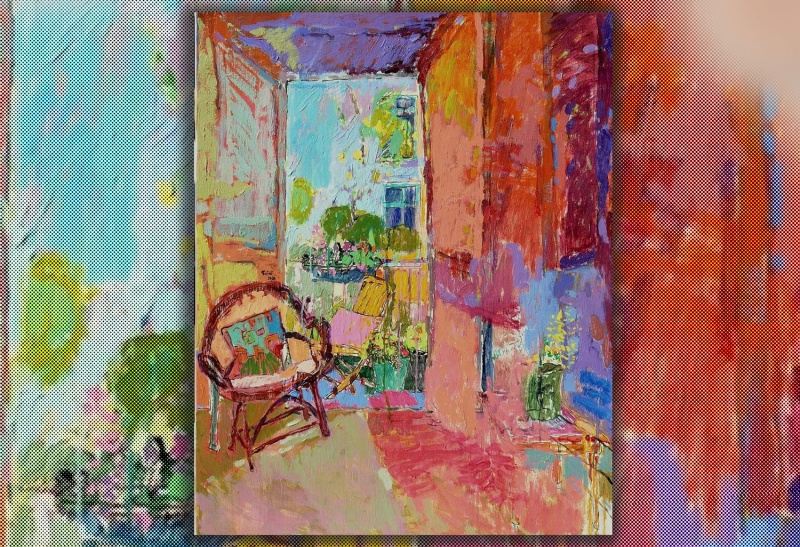 ولعل أكثر اللوحات التي تبثّ هذا النوع من الطمأنينة الهائلة التي تدفئ القلب وتُسكن الألم الوجودي وتذكّر بحضن الأم العطوف، هي تلك التي يظهر فيها كرسي مُريح أو مقعد قماشه مزهوّ ببراعم الأزهار والورود المُتفتّحة، كرسي أو مقعد إلى جانب طاولة عليها كأس أو فنجان قهوة مُحاط بالنباتات النضرة والأزهار.