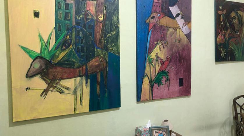 في أقسام منزل أدهم، تبدأ جولتك في المعرض الذي تحضر في غالبية لوحاته شخصية الكلب غودو. وانطلاقاً من غرفة النوم، تلفتك في اللوحات المعلقة على جدرانها وفوق سريره، رموز ترتبط ارتباطاً مباشراً بلحظات الانفجار. شتلة الـ«ألوي فيرا» التي دفن قربها الهر (انكيدو)، بعد أن هرع إلى منزله إثر الانفجار ومات متأثراً بجروحه. ورسم للديك الذي لم يتوقف عن الصياح على الرّغم من كل شيء. والنافذة السوداء التي يطل منها الفنان في لحظات اكتئاب، وعزاؤه الوحيد للتخلص منها الاتكاء على كلبه غودو. وفي غرفة الاستقبال تطالعك لوحة عملاقة للكلب غودو تستأثر بمعظم مساحة الحائط. يظهر فيها غودو البطل كما يسميه، يركض وهو يلتفت إلى الوراء كي يطمئن على صاحبه. «كما تلاحظين لقد صورته بـ6 أقدام بدلاً من 4، فهو كان يركض عني عندما كنت شبه غائب عن الوعي. إنّه بطل المعرض، لأنّ هذا التواصل الذي ولد بيني وبينه لحظة الانفجار، انتشلني من صدمتي. لقد اقتنيته في 21 يونيو (حزيران) من العام الماضي، واخترت إطلاق معرضي هذا في التاريخ نفسه من هذه السنة، تكريماً لغودو الذي استحدث هذه الطاقة الإيجابية في البيت».