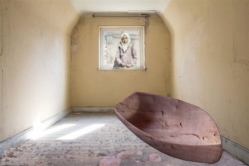 وفي صورة تركيبية أخرى، تظهر طفلة مستندة إلى جدار، بينما تحضر في مقدّمة الصورة غرفة لبيت متصدّع وقارب كأنه مصنوع من الصخر. وتؤدّي الألوان الترابية في هذه الصورة دورا مهما في تسريب الشعور بالبؤس واليباس والخوف إلى نفس المتلقي، لكن ثمة دائما نافذة لمرور الضوء في غالبية صور الفنانة، رمزا للأمل.