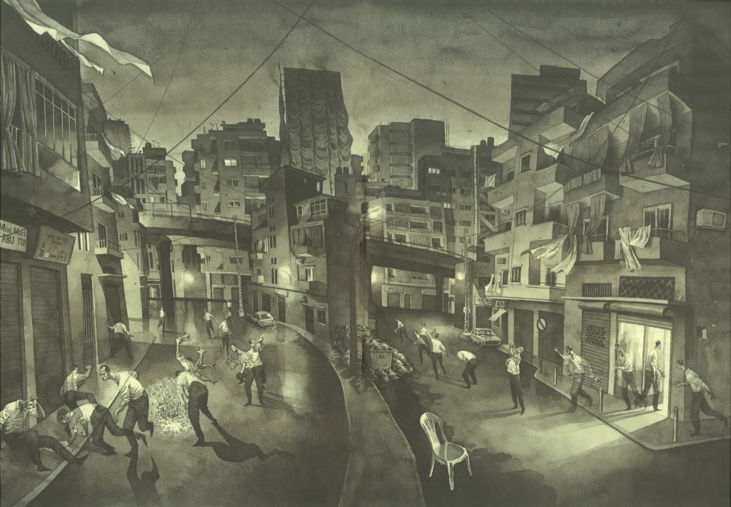 بعيداً عن كلّ ذلك، تنجح القصّة أكثر في توصيف الصراعات الفردية للشخوص، في محاولة بحثها عن معنى لحيواتها. وهو ما برع فيه أبو مهيّا تحديداً، كما حين، يتمكّن من خلال الرسم وحده، في إحدى صوره البانورامية للمدينة بإضاءتها الخافتة، من بعثرة بطله وتصوير انقساماته في عمل فني مستقلّ بذاته. يستعين بمفردات أساسيّة من مدينة بيروت وتاريخها ويوميّاتها، لكي يصنع مدينة تقبع عند نهاية العالم، يخوض أبناؤها رحلات عبثية لا تصل بهم إلا إلى نقطة البداية. بأسلوبه الذي استخدم فيه الحبر الأسود بريشته، يرسّخ أبو مهيّا تقنيّة متفرّدة في فن الشرائط المصوّرة للبالغين، تقوم على الرسم المتمهّل والبطيء والرؤية الفنية الجمالية التي تعلو على صوت الحوارات، وهذا ما نراه في نسخ الرسومات الأصليّة المعلّقة في المعرض.
