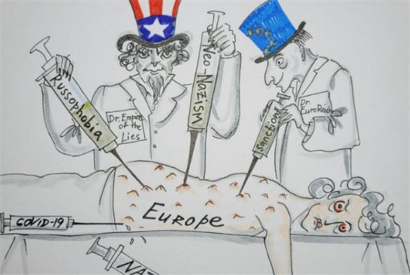 إنّه الرسم الكاريكاتوري الثاني الذي تضطر السفارة الروسية في فرنسا لحذفه، بسبب ما اعتبرته «مسيئاً». فقد نشبت مجدداً معركة بين باريس وموسكو، هذه المرة على خلفية نشر رسوم ساخرة من أوروبا وحليفتها الولايات المتحدة. جدال تصاعد ووصل الى حد تبادل البيانات بين الخارجيتين الروسية والفرنسية، فيما كان لافتاً في هذه القضية، تذكير فرنسا بتشدقها بحرية التعبير التي يبدو أنّها تقف عند أعتاب المسّ بكياناتها الإقتصادية والسياسية! إذ نشرت السفارة الروسية في باريس رسمين كاريكاتوريين: الأول يظهر مدى انبطاح الدول الأوروبية وجيرانها المنضورين سابقاً تحت لواء «الإتحاد السوفياتي»، حيال الأميركيين بطريقة مذلة، والثاني يصوّر القارة الأوروبية على شاكلة انسان مريض يتلقى حقناً مكتوباً عليها «النازية الجديدة» و«روسوفوبيا»، من رجلين أحدهما يمثل الولايات المتحدة وتتصدر عبارة «أمبراطورية الكذب» قميصه، والآخر يمثل «الإتحاد الأوروبي». وعلى اثر نشر الرسم الأخير، قامت الخارجية الفرنسية باستدعاء السفير الروسي لديها أليكسي ميشكوف، للإحتجاج على الكاريكاتور الساخر، واعتباره «غير مقبول» فيما علقت بالقول: «نحاول أن نبقي على قناة حوار مع روسيا وهذه الأفعال غير ملائمة بالمرة». ولم يطل رد الخارجية الروسية التي قالت ساخرة عبر المتحدثة باسمها ماريا زاخاروفا، على قناتها الرسمية على تيليغرام: «حقاً، أليس رؤساء ووزارة خارجية فرنسا هم الذين كانوا يعلّموننا بأنّ أي رسومات كاريكاتورية أمر طبيعي، حتى تلك الفظيعة التى نشرتها «شارلى إيبدو»؟ لقد قررنا اتباع نصيحتهم واستخدام الهجاء الذي يعتبرونه دليلاً على حرية التعبير، والآن لا يعجبهم شيء»! يُذكر أنه في العام 2006، نشرت صحيفة «شارلي إيبدو» الساخرة 12 رسماً كاريكاتورياً صنّفت على أنها مسيئة الى النبي محمد. وفي العام 2015، تم الاعتداء على طاقمها في باريس وخلّف الإعتداء أكثر من 12 ضحية.