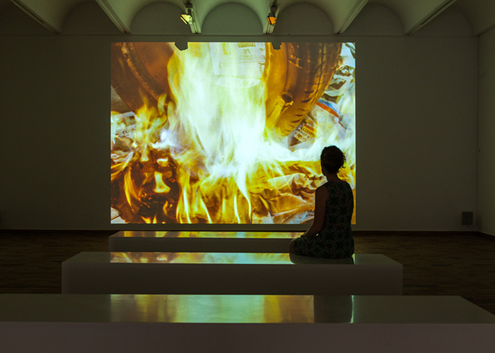 في العمل الأول نحن لا نرى عمل تجهيز بل فيلماً على شاشة إسقاط، وفيه نشاهد عجوزاً يحكي عن صعوبة جرّ جبل وتحريكه من مكانه، لتتالى بعدها صور احتفالية ومجموعة من الأشخاص الذين يشاهدون شاشات مليئة بالمعلومات المشفّرة، لننتقل بعدها لمشاهدة مقاطع من رياضة غريبة نوعاً ما، موجودة شمالي اليابان التي تحوي الحلبة الوحيدة في العالم لممارستها، وهي مسابقة بين عشرة أحصنة كلّ منها يجرّ قطعة معدنيّة كبيرة، الهدف منها ليس السرعة بل القوة والاحتمال للوصول إلى خط النهاية.