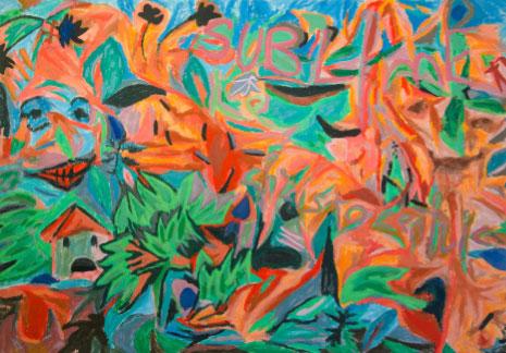 لكن بالعودة الى معرضه في «تانيت»، فالمادة - ولو أشار بيانها الفني إلى حالة عاطفية ما- تبدو ساركاستية/ تهكّمية أو حتى كاريكاتورية. في homerun الملوّنة بمادة الأكريليك وتعتبر من أكبر اللوحات المعروضة، نجد للطرافة مثلاً بيتاً على الطريقة «الساذجة» أشبه بـ «إيموتيكون مندهش». ونقرأ كلمات مكتوبة بشكل مموه ككلمة sublime في الجزء العلوي من اللوحة من الوسط باتجاه اليمين. لكن هذه الكتابات لا تقترب حتى من التأليفات والكلمات التي يشكّلها جوغيان نفسه بوضوح على الورق بأسلوبه الطباعي الخاص. أو مثلاً لوحة فيها الكثير من الاخضر والأزرق حيث يخطّ الفنان في وسطها تقريباً «روح النعناع»! لوهلة أولى، نشعر كأنه يعبر بلغة تشكيلية تعبيرية ولكن مستخدماً مفردات لغة أخرى غير متناسبة مع المضامين. العجينة هنا غير مكتملة، والتأليف يوحي أن الفنان كان يريد «ملء الفراغ باللون بالمناسب» (أو بحسب المزاج) ليكمل صياغة كل هذه المساحة الكبيرة التي - والحق يقال- تفرض نفسها وهيبتها على الرائي بشكل بديهي، بسبب الضخامة. ولكن ملء المساحة هذا يكاد يكون أقرب إلى ثرثرة لطيفة تملأ فراغ الوقت، من دون أن تقول شيئاً للرائي. بل ربما لتقول أشياء من الفنان ولنفسه حصراً، وهو شيء حميد بكل الأحوال. فهل هذا بذاته ما أراد إيصاله جوغيان؟ أم أنه فعلاً يملأ فراغاً يسرّه هو فقط دون سواه؟ ثم ربما أراد بغرض البيع أن يتشاركه مع الناس والمقتنين عبر «غاليري تانيت»؟