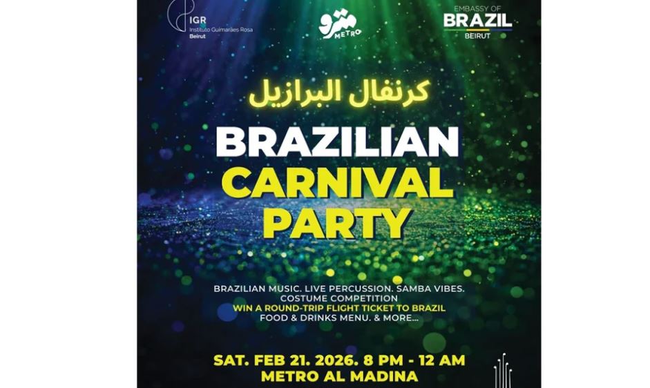تُقام في بيروت أمسية احتفالية بعنوان "كرنفال البرازيل"، بمبادرة من "سفارة البرازيل في لبنان" وبالتعاون مع "مركز غيمارايس روزا - بيروت"، على مسرح "مترو المدينة" الحمرا - بيروت، بين الساعة 8:00 مساءً ومنتصف ليل السبت 21 شباط 2026.