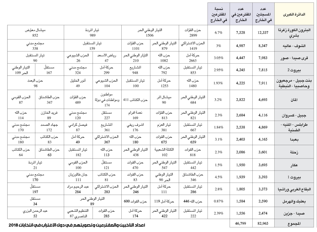 في موازاة ذلك، نشرت المنصة التابعة لـ «كلنا إرادة» و«نحو الوطن» أمثلة مدعمة بالأرقام حول قدرة المغتربين على التغيير في نتائج الانتخابات. وجاء في المنشور أن دائرة بعبدا كانت تحتاج إلى 9702 صوت خلال انتخابات 2018 بالإضافة إلى 4992 صوتاً اقترعوا لـ«الأحزاب البديلة» حتى تنال مقعداً نيابياً. فيما دائرة النبطية، بنت جبيل، مرجعيون، حاصبيا حيث نالت المعارضة 2262 صوتاً، تحتاج إلى 20 ألف صوت إضافي للفوز بمقعد. كذلك تم عرض لواقع أرقام بيروت الأولى والثانية، بعلبك الهرمل، زحلة، البقاع الغربي وراشيا.