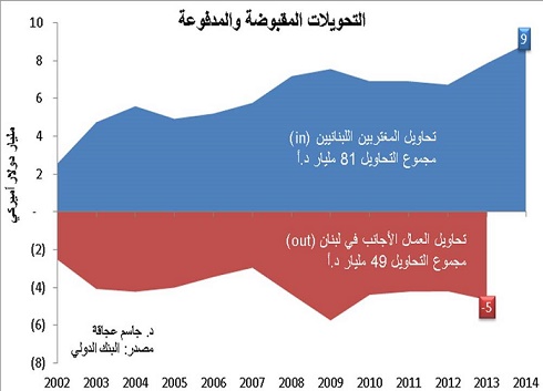 وإذا ما قمنا بجمع تحاويل المغتربين اللبنانيين منذ العام 2002 حتى العام 2014، نرى أن مجموع هذه التحاويل بلغ 81 مليار دولار أميركي، وهذا الرقم يفوق دين لبنان العام والبالغ 70مليار د.أ.