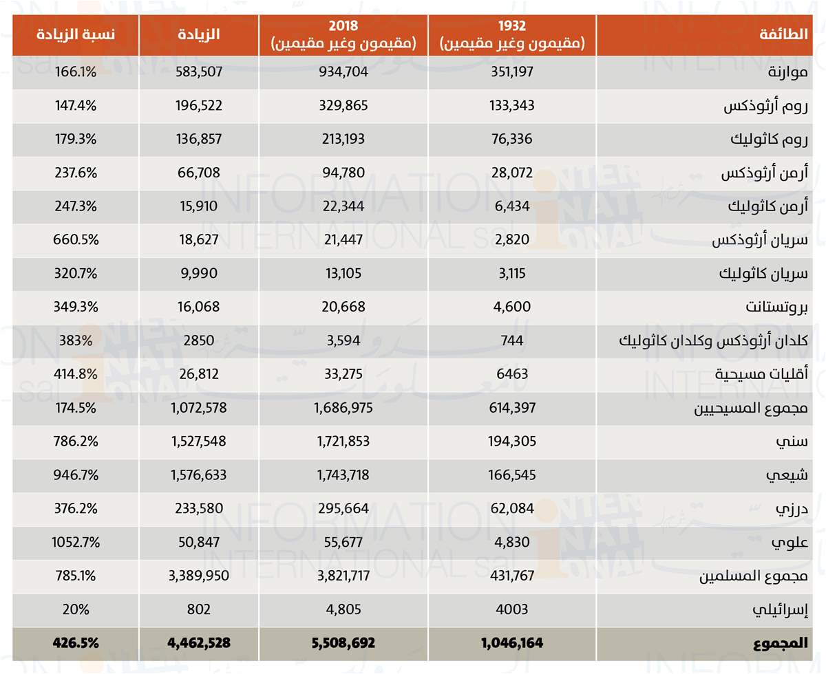 1- زادت أعداد اللبنانيين بين الأعوام 1932-2018 بمقدار 4.4 مليون أي بنسبة 426%. وهذه النسبة لم تكن واحدة لدى الطوائف، فقد بلغت لدى المسيحيين نسبة 174.5% مقابل 785.1% لدى المسلمين.